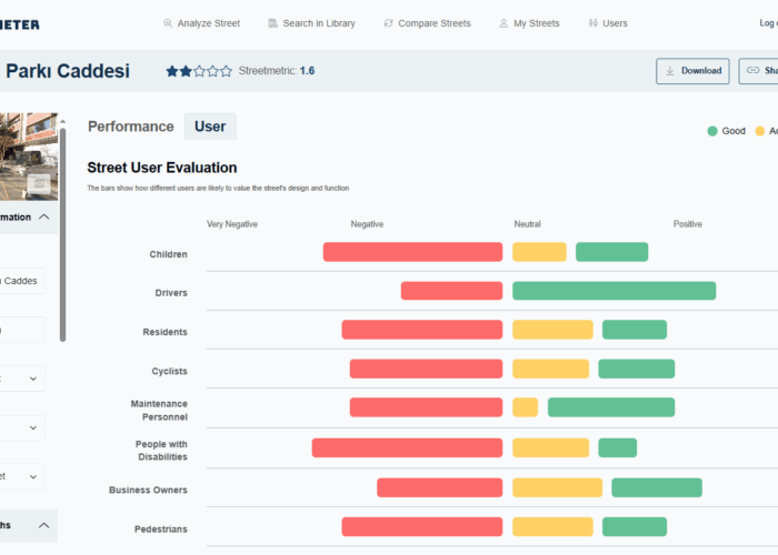 It also evaluates performance from the perspective of different user groups (e.g., children, people with disabilities, cyclists), and assigns a Streetmetric score (1–5 stars) for easy comparison between streets.